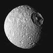 Hyperion wobbles like a drunk in its orbit and seems to be hollow or at least built like a sponge; it is only half as dense as water. Finally, tiny Mimas knocked people back when they first saw it. It is a 'lookalike' of Darth Vader’s Death Star.